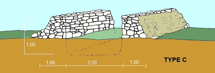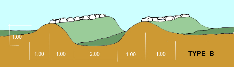 Ce type de route possède les mêmes caractéristiques que le type A mais le sommet des talus comporte un muret de pierre. La profondeur depuis l’intérieur atteint l,20m au niveau des murets. Il y a huit routes de ce type, elles se trouvent toutes dans la région de MUA (tableau n°11).