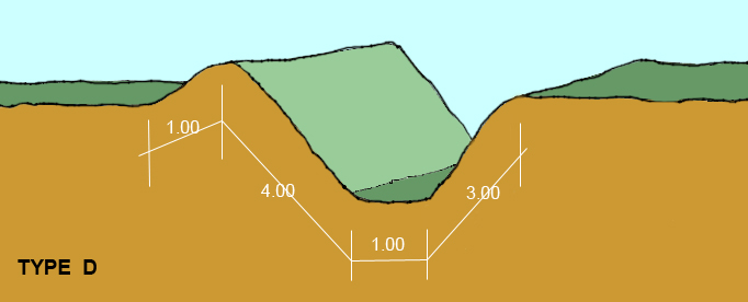 Ces routes diffèrent des précédentes par leurs dimensions et par leurs formes. L’intérieur de la route est toujours plus bas que le sol environnant. Un des talus est plus élevé que l’autre, il forme une pente de 4 mètres de longueur alors que l’autre n’atteint que 3 mètres. L’espace entre les sommets des deux talus atteint 5 mètres, pafois le côté de plus bas peut ne pas posséder de talus. La hauteur de ces talus avoisine 1 mètre et parfois on y trouve des cailloux. A l’encontre des routes de type A et B la largeur de la surface de la route est très étroite par rapport à l’ensemble, elle peut atteindre 1 mètre. Le profil forme plus un angle droit qu’un arc de cercle comme sur les routes des types A et B.