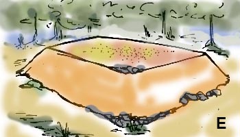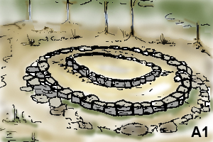 MONUMENTS DE TYPE ASépulture en terre en forme de tertre rond ou ovale presentant deux étages. Aucune de celles observées jusqu’alors ne dépasse 1 mètre de haut. Nous les considérons donc tous comme bas. La différence de hauteur entre ces deux étages n’est pas très grande. On subdivise ce type en deux catégories.