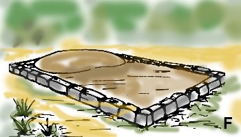 Sépulture en terre haute de forme quadrangulaire et plate, dotée parfois d’un entourage de blocs de pierre.